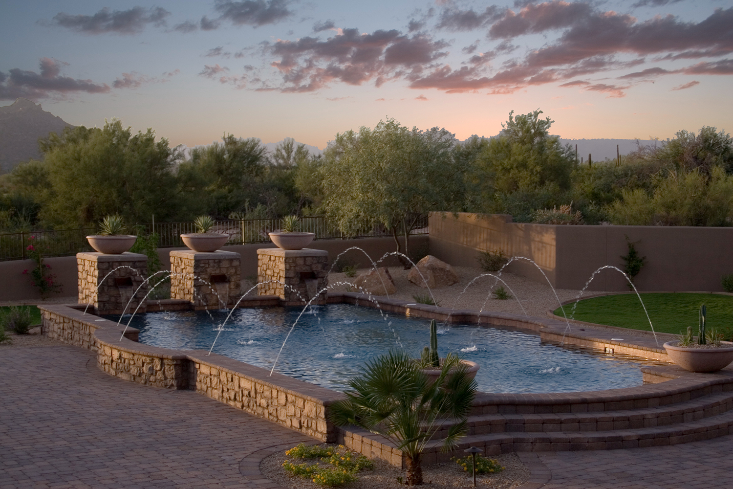 Freeform pools integrate beautifully with Arizona’s native landscape. They complement Tuscan, Mediterranean, and Southwestern architectural styles particularly well, though we’ve designed contemporary freform pools as well.