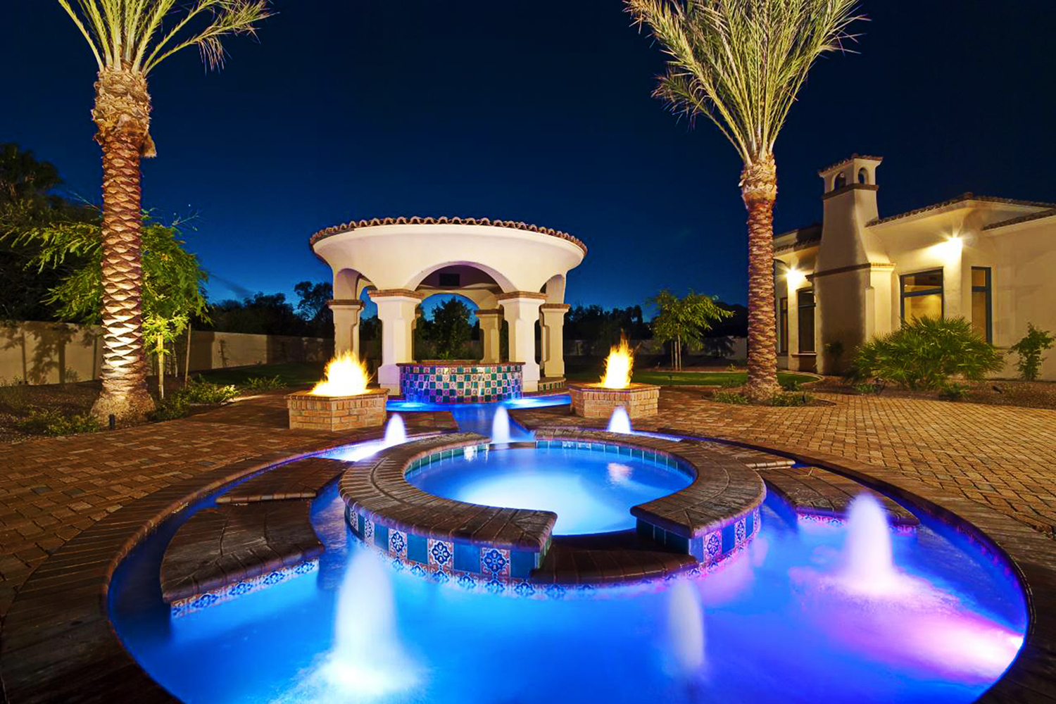 Projects featured: Waterfall and spa integration, Fire and water feature combination, Underwater LED lighting design, Full outdoor living ecosystem integration.