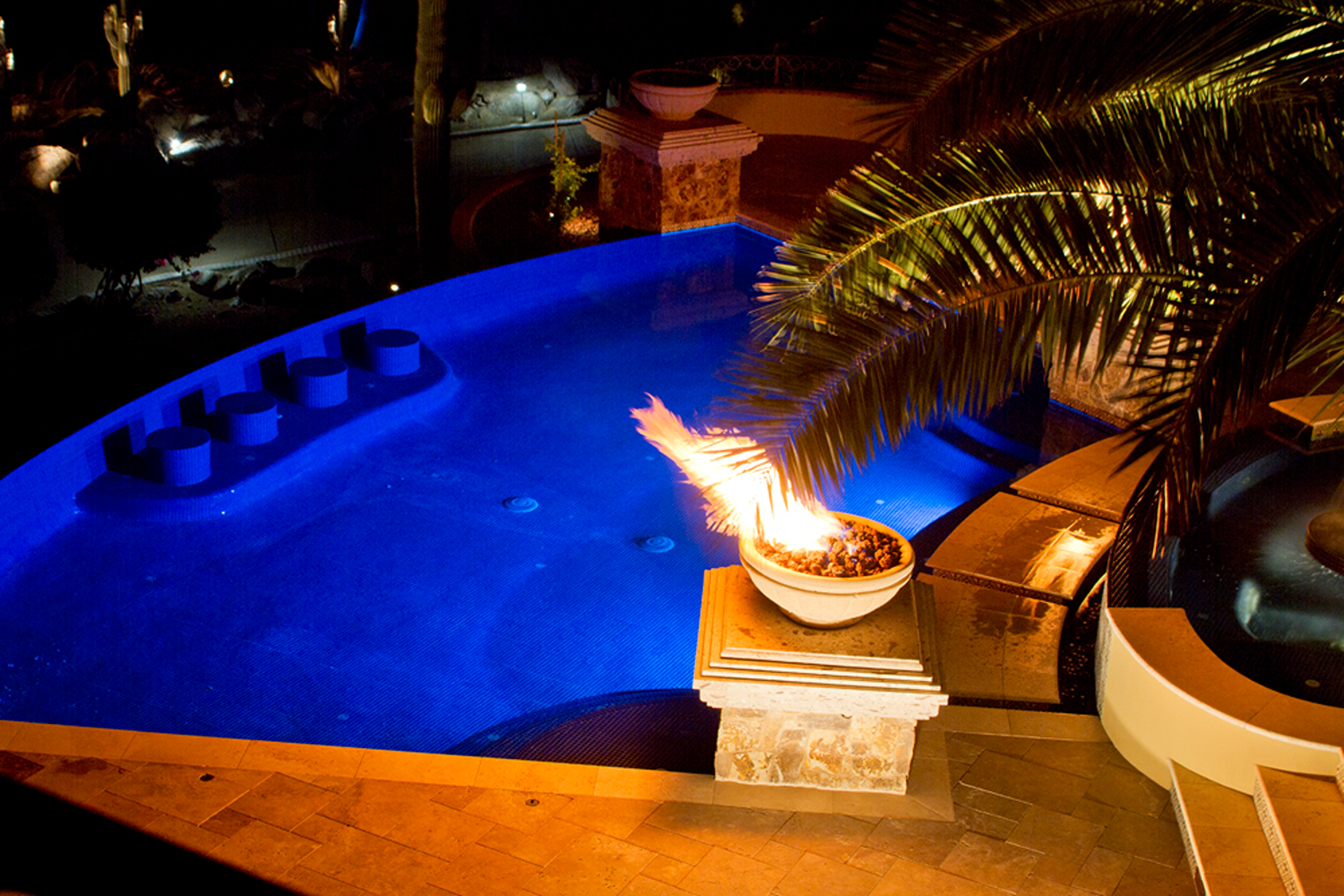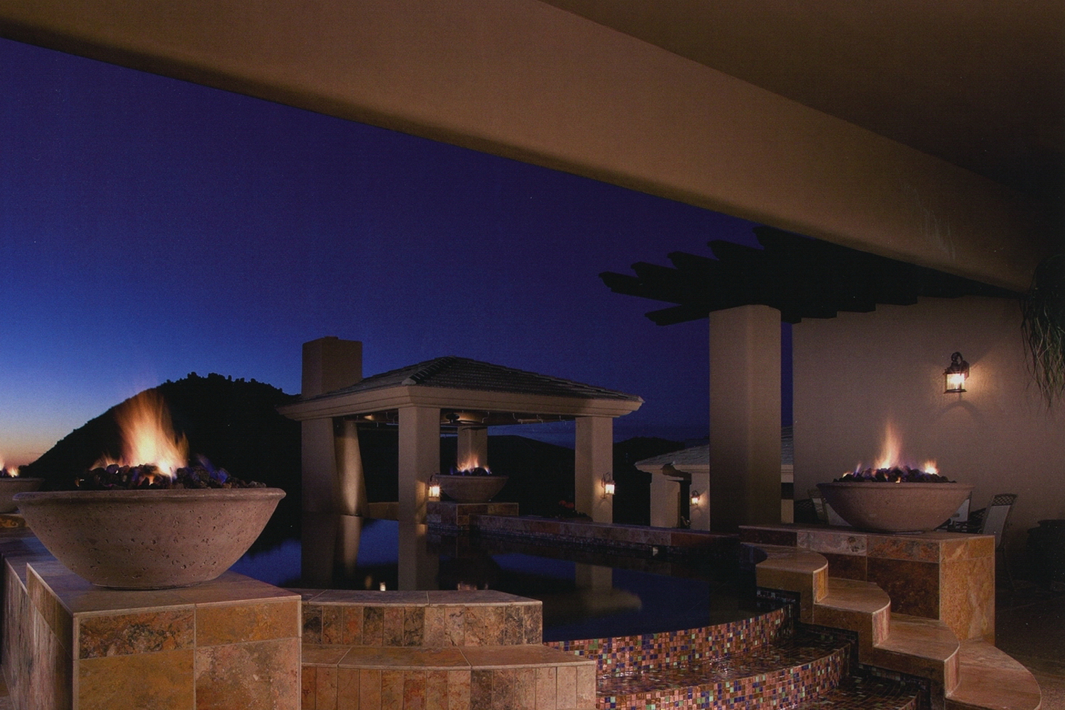 Projects featured: Waterfall and spa integration, Fire and water feature combination, Underwater LED lighting design, Full outdoor living ecosystem integration.Â