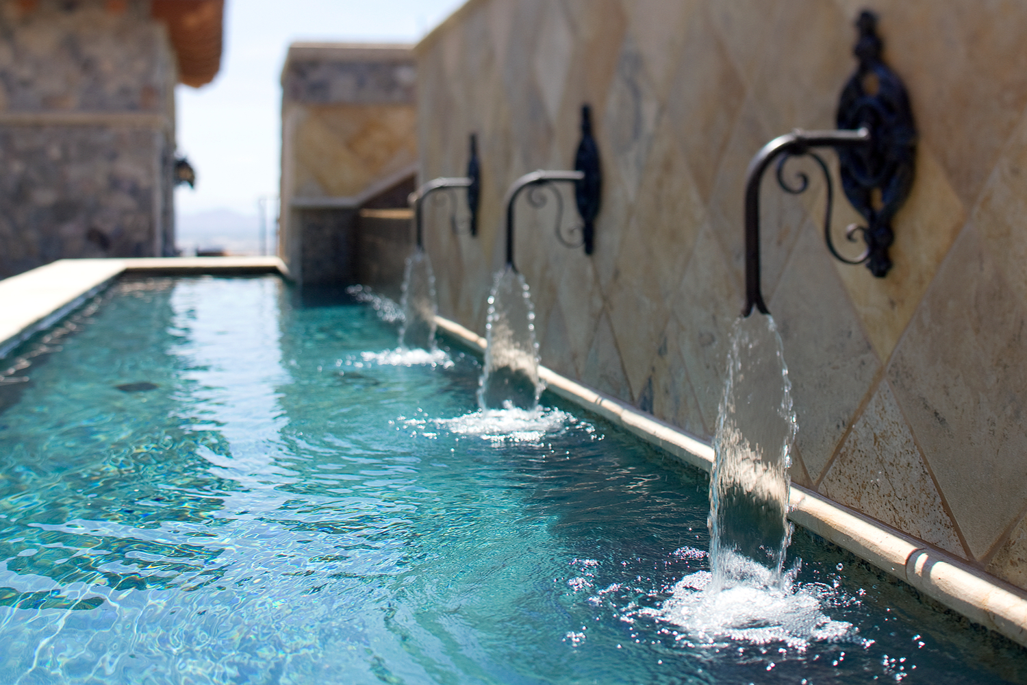 Constant water movement around the entire edge of the pool—hypnotic, beautiful, and technically sophisticated. Water cascades down all four sides, collected in a trough system. This design creates a sense of movement and luxury that static pool edges don’t provide.